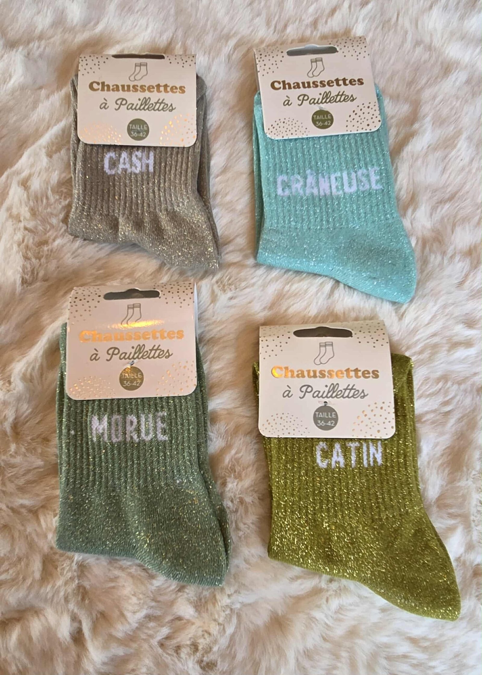 Chaussettes à Paillettes avec message Cash / Crâneuse / Morue / Catin